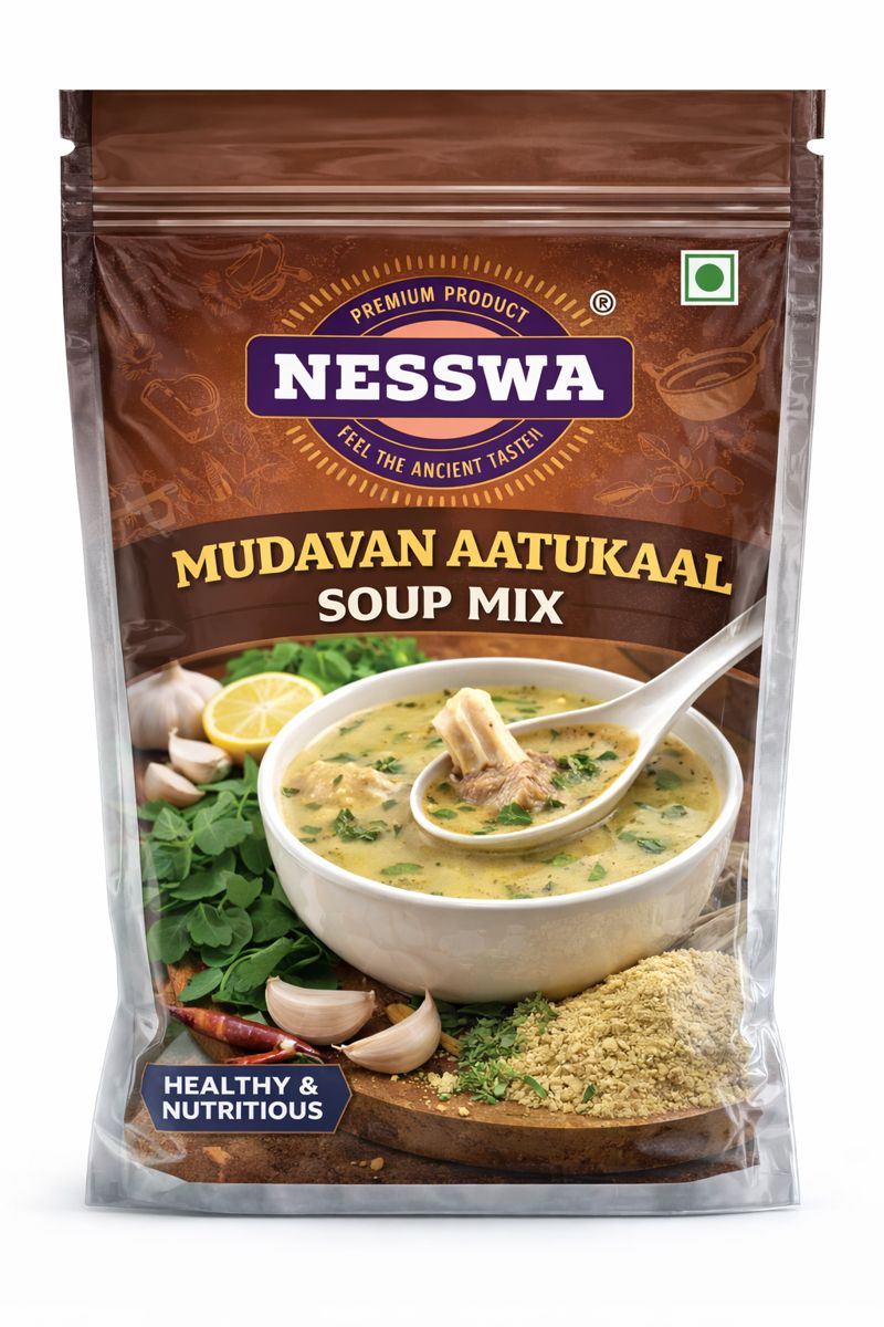 Our Mudavan Aatukaal Soup Mix is crafted from a blend of traditional herbs and spices, carefully selected to complement the rich flavour of mutton leg soup. It enhances aroma, taste, and nutritional value, bringing a wholesome and authentic South Indian culinary experience to your table. Free from artificial preservatives, this mix ensures consistent flavour and natural freshness in every preparation.