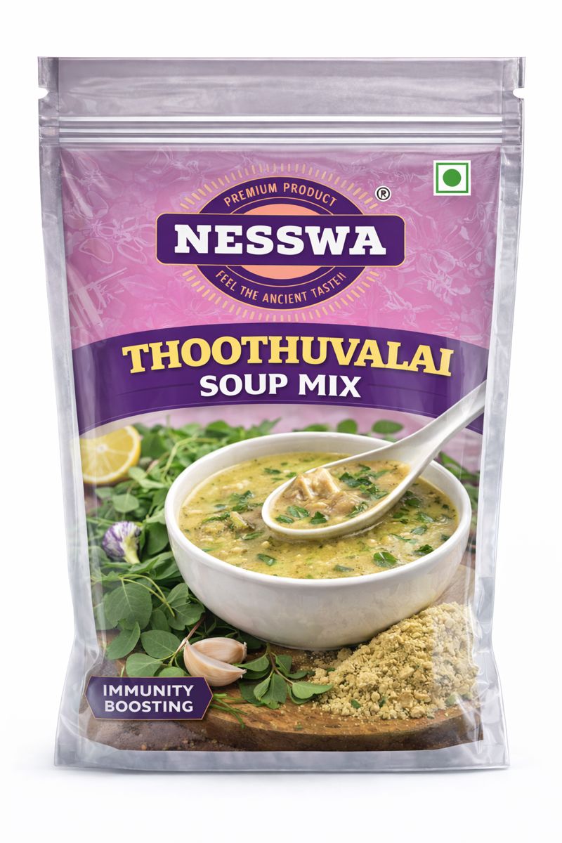 Our Thoothuvalai Soup Mix is made using Thoothuvalai leaves and a selection of traditional herbs and spices, carefully processed to retain maximum flavour and health benefits. Known for its respiratory and immunity-supporting properties, this soup mix delivers aromatic taste and natural goodness. Simple to prepare at home, it is free from artificial colours and preservatives, ensuring both wellness and authentic flavour in every bowl.